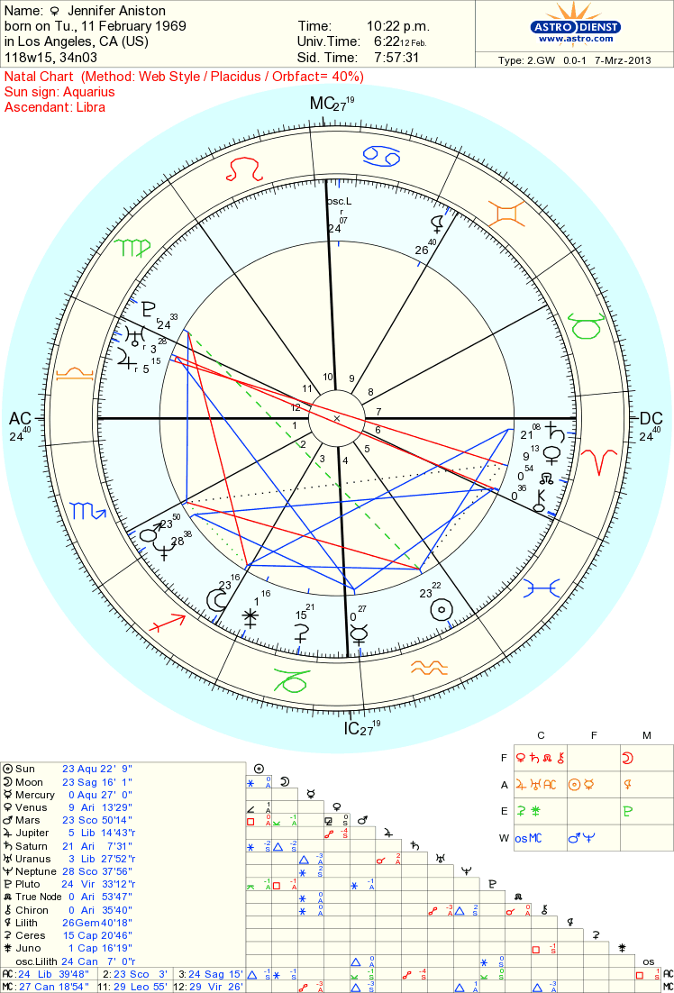 Een beroemd voorbeeld van iemand met Noordermaansknoop in Ram is Jennifer Aniston, bekend geworden door haar rol van Rachel in de serie “Friends”. Jennifer is geboren op 11 februari 1969 om 22:22u te Los Angeles. In haar geboortehoroscoop staan allerlei factoren die maken dat zij een late ontwikkeling doormaakt en pas rond haar 50ste haar doorbraak naar haar Noordermaansknoop in Ram gaat maken. Pas dan komt ze lekker in haar vel te zitten en trekt ze de juiste liefdespartner aan. Voor die tijd is elke relatie een moeilijke exercitie voor haar. Zij heeft Chiron conjunct haar Noordermaansknoop en Uranus conjunct haar Zuidermaansknoop. Deze standen maken dat zij het gevoel heeft veel in te moeten leveren in een relatie maar dat een goede relatie dat vereist. Een relatie is voor haar gevoel een constante strijd tussen behoud van haar individualiteit en vrijheid en het gevoel je helemaal te moeten opofferen voor je partner. Relatief laat in haar leven komt ze erachter dat het een valse tegenstelling is die ze zelf creëert. Ze ontdekt dan dat ze pas werkelijk goed kan relateren als ze volledig in haar eigen kracht staat. Maar tegen die tijd heeft ze al enkele heftige relaties achter de rug. De meest bekende ex-partner is Brad Pitt. Ze waren tijdens hun huwelijk het beroemdste echtpaar van Hollywood maar na bijna vijf jaar huwelijk verliet hij haar voor Angelina Jolie. Na enkele jaren therapie omschreef ze de relatie als “gecompliceerd maar waardevol”.