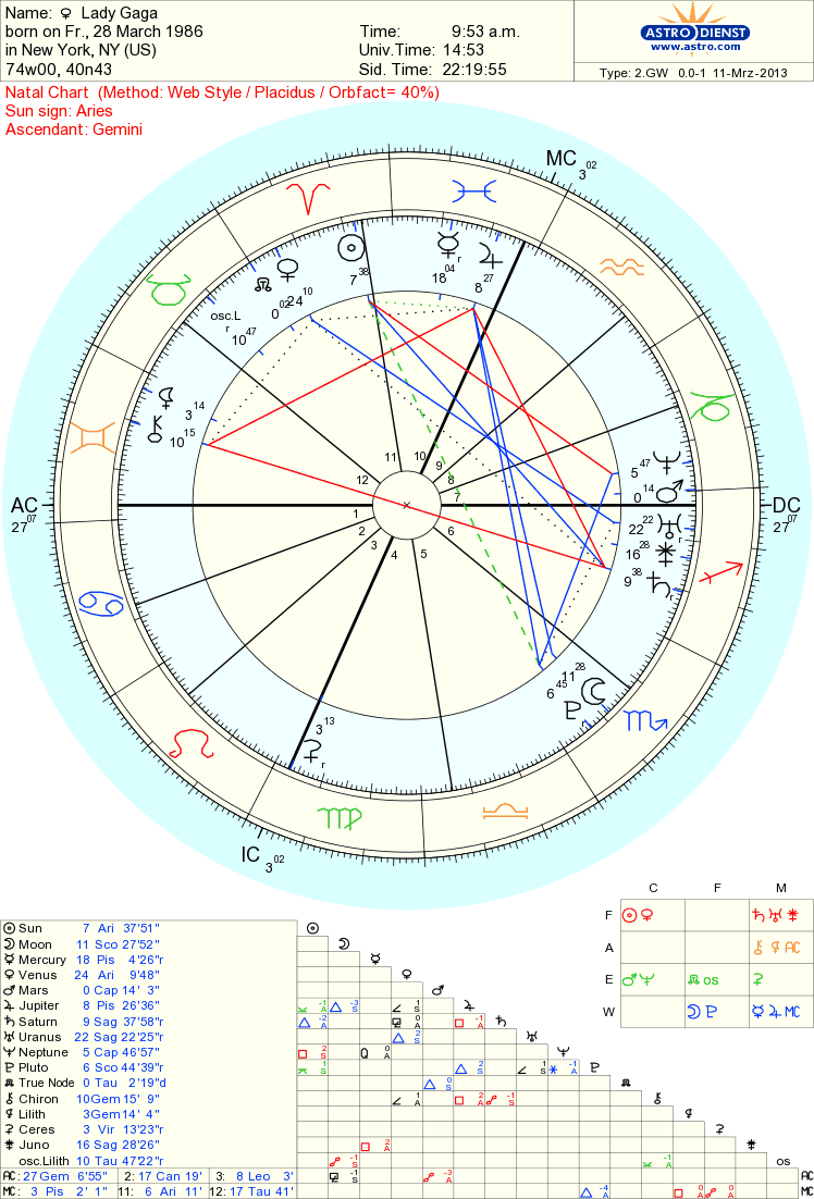 Voor Quantum Astrologen komt deze aankondiging niet als een verassing! Het valt precies samen met de horoscoopfactoren die ervoor zorgen dat zij vlak voor haar 27ste haar eerste stappen gaat zetten naar haar Noordermaansknoop in Stier. (Lady Gaga wordt 27 jaar op 28 maart 2013). Het wordt tijd dat Lady Gaga haar persoonlijke behoeftes en haar gezondheid voorop gaat stellen. Maar hoewel haar gezondheidsproblemen sterke aanwijzingen voor haar zouden moeten zijn om de baken drastisch te verzetten, zal zij vanwege de krachtige Pluto stand bij haar Zuidermaansknoop in Schorpioen voorlopig blijven vasthouden aan het succes en het stressvolle, maar onbevredigende, bestaan van een wereldster.