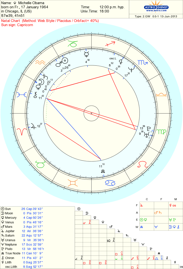 Presidentsvrouw Michelle Obama, geboren op 17 januari 1964 in Chicago, heeft Noordermaansknoop in het teken Kreeft. Voordat zij zich overgaf aan de rol van presidentsvrouw had zij zelfs een bloeiende carrière als advocaat. Dit wordt aangegeven door haar Zuidermaansknoop in het ambitieuze teken Steenbok. (De Zuidermaansknoop ligt in elke geboortehoroscoop recht tegenover de Noordermaansknoop). Michelle was lange tijd de belangrijkste kostwinner van het gezin en zij gaf prioriteit aan haar eigen ambities. Rond haar 41ste zorgde factoren in haar horoscoop ervoor dat zij de overgang ging maken van haar Zuidermaansknoop in Steenbok naar haar Noordermaansknoop in de Kreeft. Deze overgang viel niet toevallig samen met de voorbereidingen van de lange verkiezingscampagne van Barak Obama die uiteindelijk zouden leiden tot zijn presidentsschap. In 2007 zette ze haar eigen werkzaamheden op een lag pitje om zich met volle overgave te richten op de carrière van haar man. Met de overgang van haar Zuider- naar haar Noordermaansknoop liet ze de controle los en legde haar toekomst in de handen van haar partner. In interviews onderstreept ze haar meer ondersteunende, verzorgende rol met uitspraken als: “My job is not a senior adviser.”
