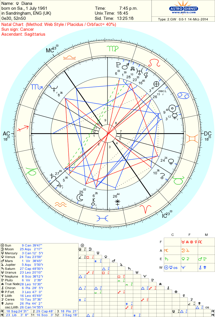 Prinses Diana, geboren op 1 juli 1961 om 19:45u te Sandringham, is geboren met de Noordermaansknoop in het teken Leeuw. Prinses Diana was de eerste vrouw van Prins Charles en de moeder van William en Harry. De geboorte van Diana was al meteen omgeven door teleurstelling en miskenning. Zij was de derde dochter van Edward-John Spencer, Lord Althrop. Hij had al twee dochters en had gehoopt op een mannelijke erfopvolger.